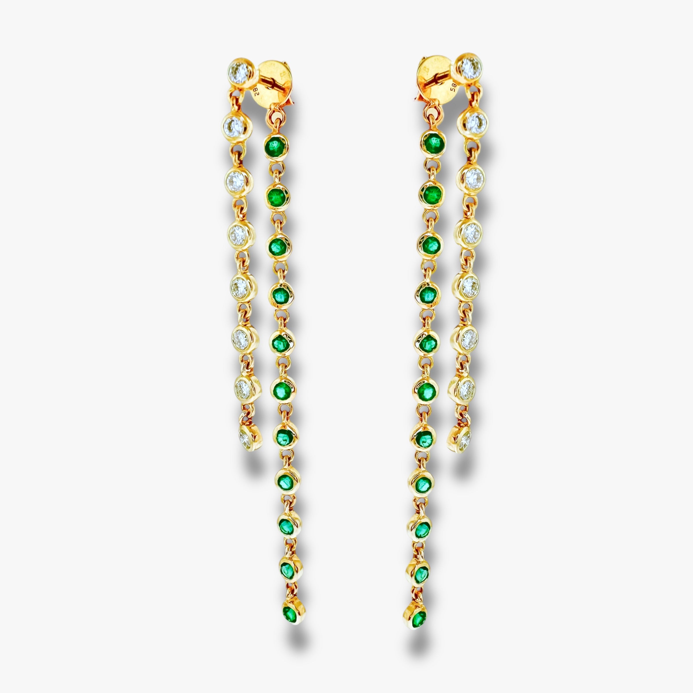 Say hello to your new favorites. A study in sleek lines and luminous color, these bezel-set drops bring a jolt of energy with every move. Two staggered cascades—one diamond, one juicy emerald—create a silhouette that feels both effortless and architectural.