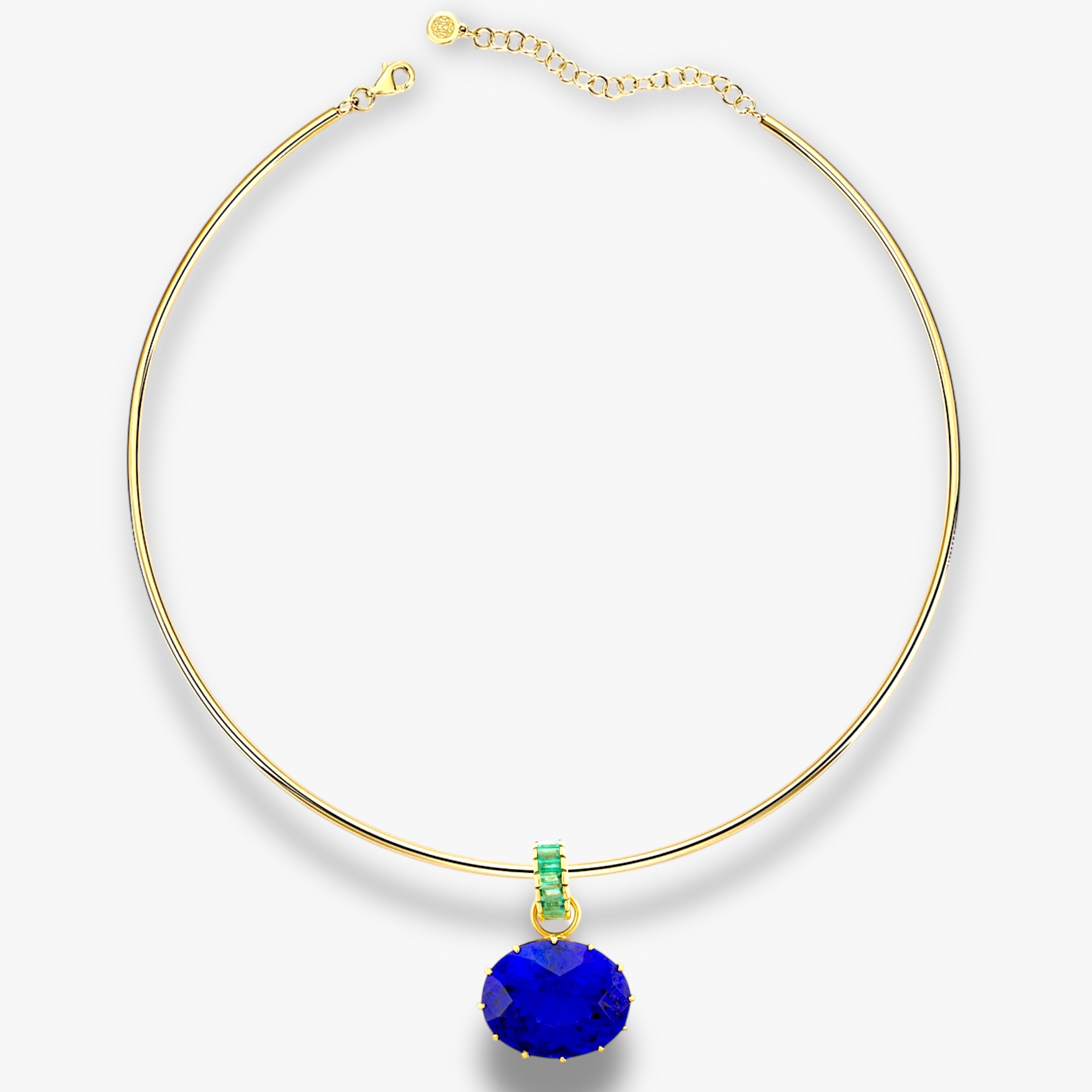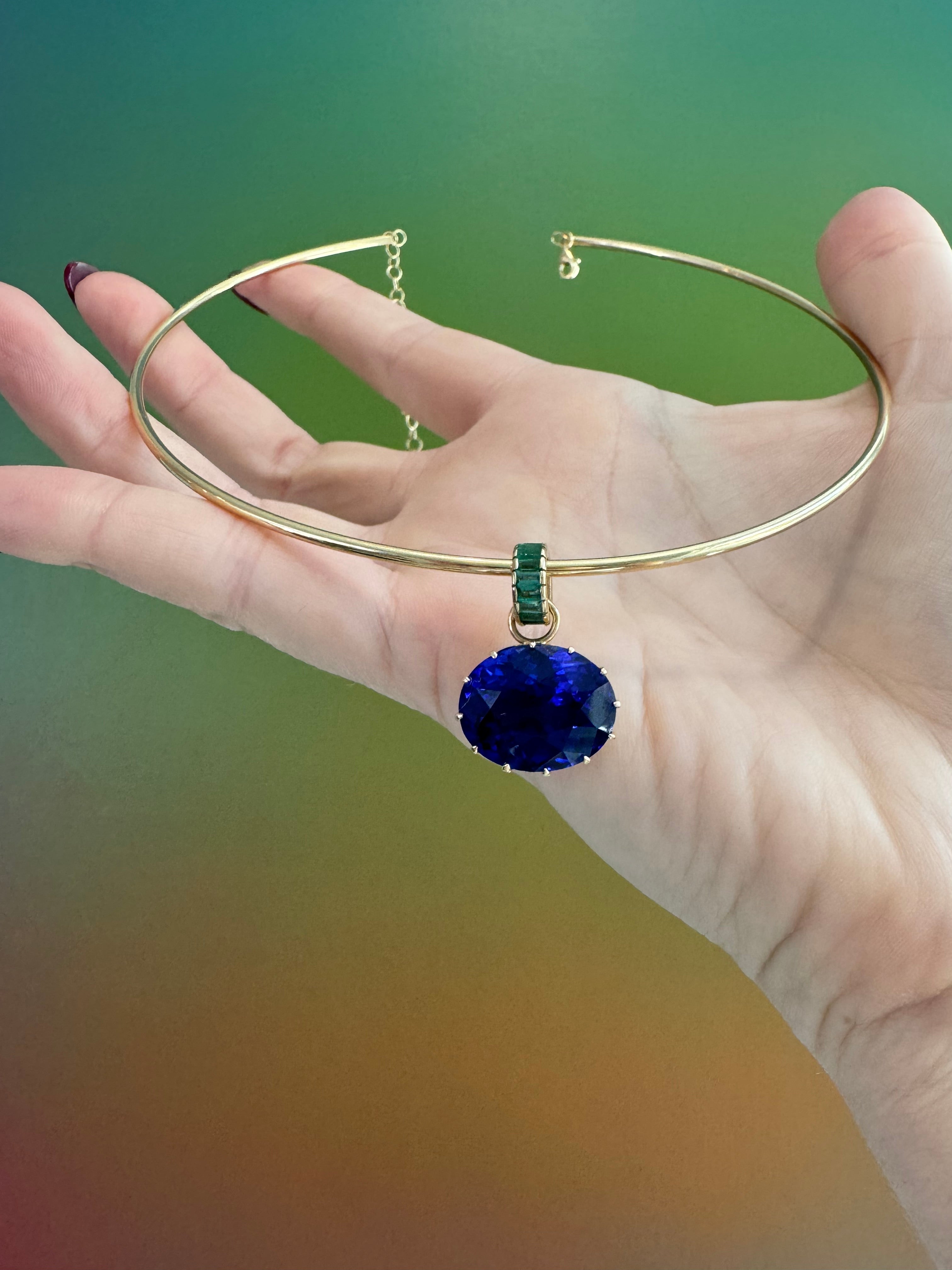 The ultimate power piece. Sculptural and commanding yet effortlessly wearable, this collar necklace pairs a vivid electric-blue tanzanite with a sleek band of yellow gold accented by emerald baguettes. Designed for versatility and comfort, it transitions seamlessly from the boardroom to the red carpet to a candlelit dinner—embodying the perfect fusion of modern architecture and antique soul.