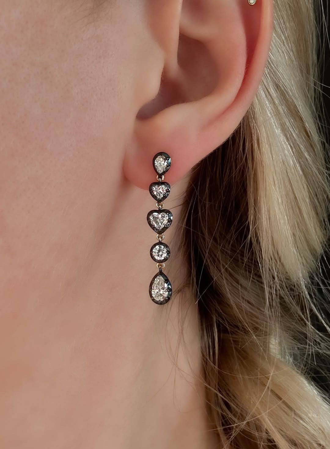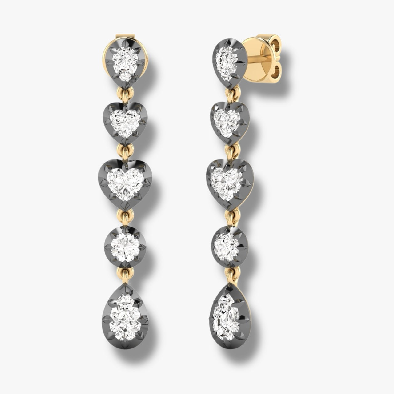 These mixed-shape collet-set diamond drop earrings feature a sculptural cascade of fancy-shaped lab-grown diamonds—hearts! pears! rounds!—each framed in a moody interplay of black rhodium and warm fourteen-karat yellow gold. The effect is modern-gothic romance: darkened metal that heightens the fire of every stone, clean lines that nod to antique craftsmanship, and a long, kinetic silhouette that moves with you. Hand-finished, distinctive, and designed to stand out in every room.