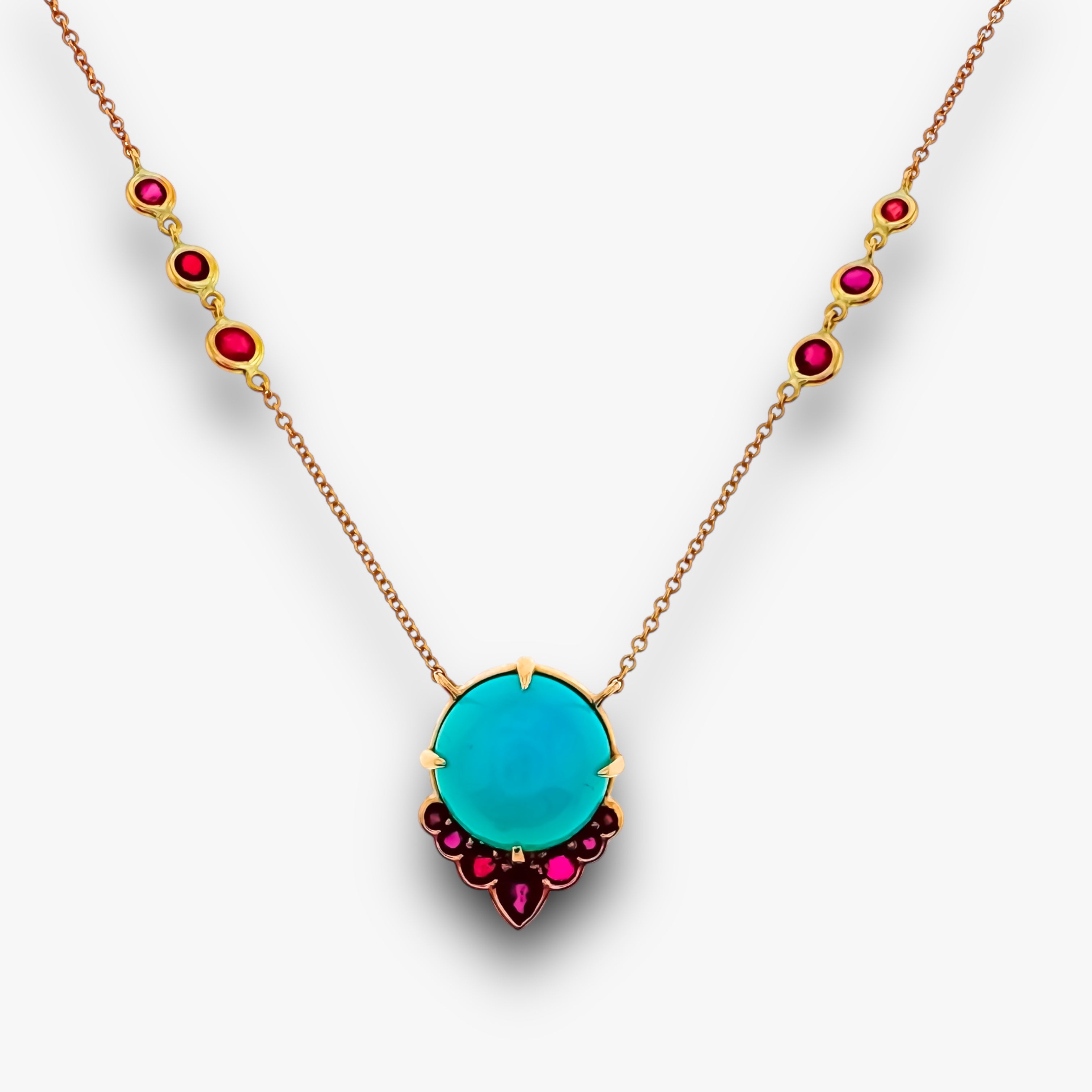 Dive into a world of vibrant colors and mouthwatering play-of-color with this stunning one-of-a-kind necklace. An electric blue Ethiopian opal is offset by captivating purplish-red rubies, and is a color combination designed to turn heads. The opal featured in this necklace is part of a recent discovery of new opals in Ethiopia, showcasing an otherworldly play-of-color and naturally confectionary hues, inspiring our Candy Colors Collection.